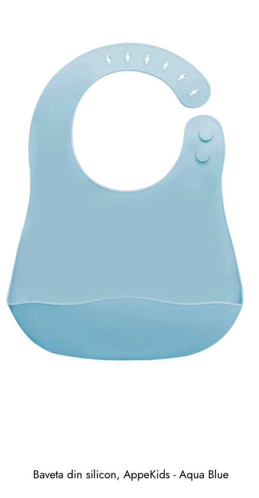 - Baveta din silicon, AppeKids – Aqua Blue – o gasesti aici.