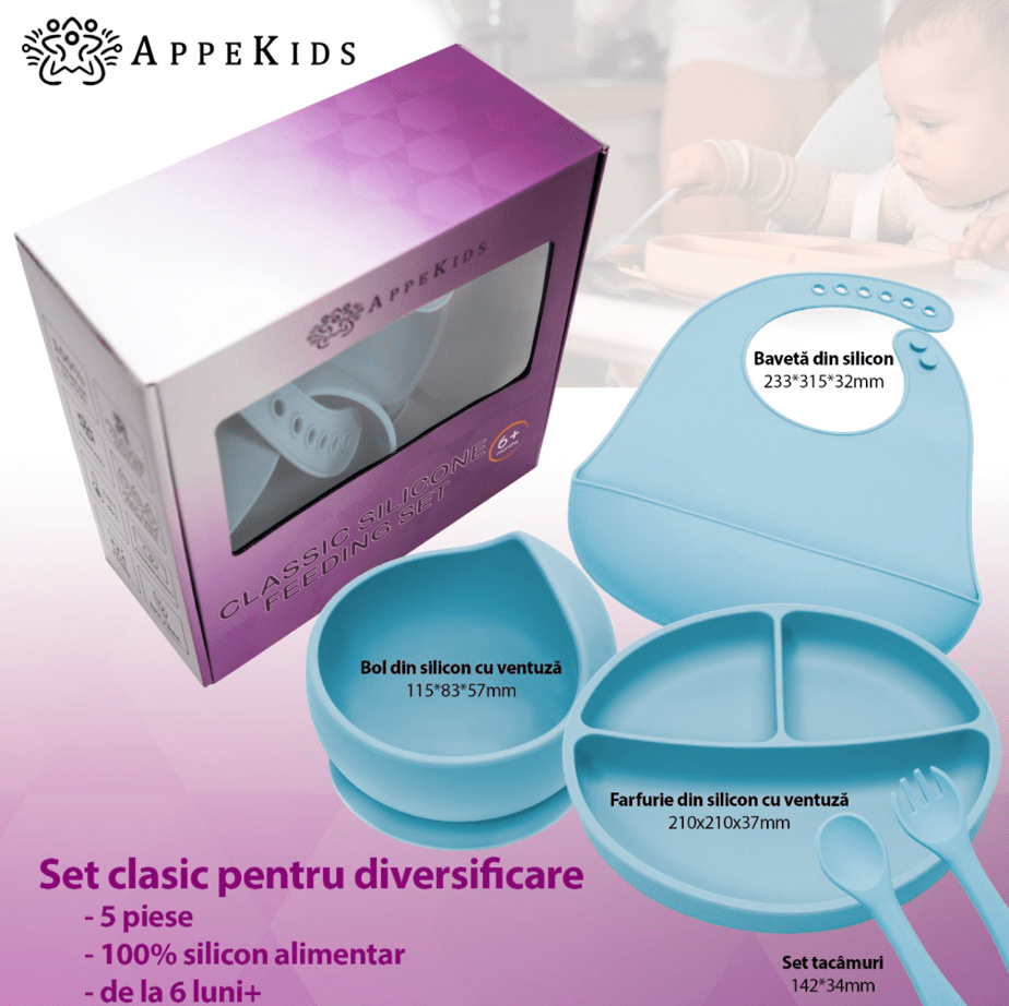 - Set Diversificare, AppeKids, 100% Silicon, Classic – Aqua Blue – îl găsești aici.